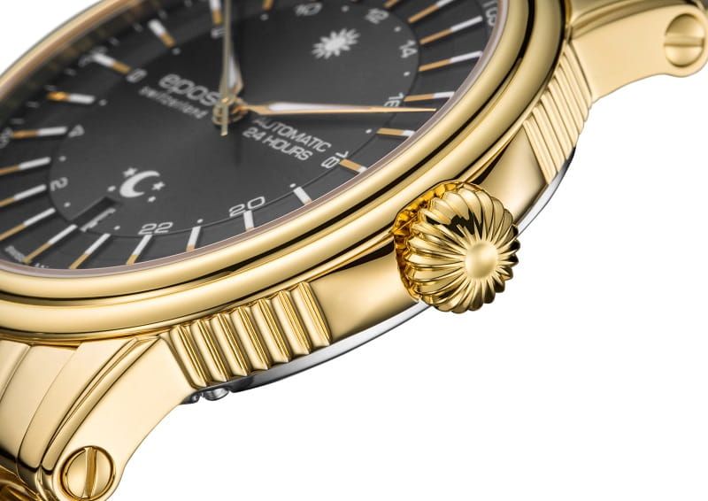 Epos Emotion 24 Hours 3390.302.22.14.32 Zegarek męski Epos Emotion 24 Hours 3390.302.22.14.32 to doskonały wybór dla mężczyzn ceniących elegancję i precyzję. Wyprodukowany przez renomowaną szwajcarską markę Epos, łączy w sobie klasyczny design i nowoczesną technologię. Koperta oraz bransoleta tego modelu zostały wykonane ze stali szlachetnej, złoconej metodą PVD, co nadaje mu wyjątkowego charakteru i luksusowego wyglądu. Model ten charakteryzuje się funkcją 24-godzinnego wyświetlania czasu oraz datownikiem dni miesiąca, co czyni go nie tylko estetycznym, ale także praktycznym wyborem na każdą okazję. Jego szara tarcza została osłonięta szafirowym szkiełkiem z powłoką antyrefleksyjną, co zapewnia doskonałą czytelność oraz chroni przed zarysowaniami. Wyjątkowe detale Zegarek Epos Emotion 24 Hours napędzany jest precyzyjnym, szwajcarskim mechanizmem automatycznym ETA 2892-A2, który jest widoczny przez przezroczysty dekiel. Mechanizm ten charakteryzuje się rezerwą chodu do 42 godzin, co jest idealnym rozwiązaniem dla osób, które nie noszą zegarka codziennie. Jego wykończenie jest dopracowane w najdrobniejszych szczegółach, co świadczy o kunszcie zegarmistrzowskim marki Epos. Cechy szczególne: