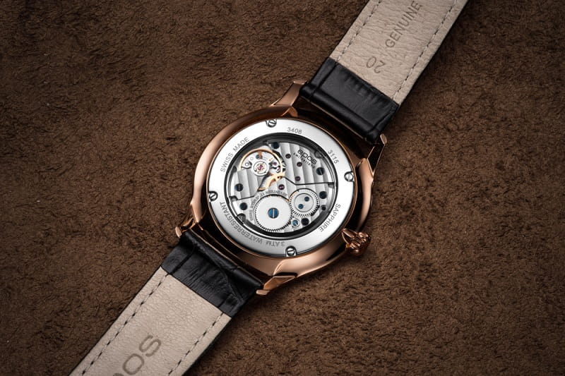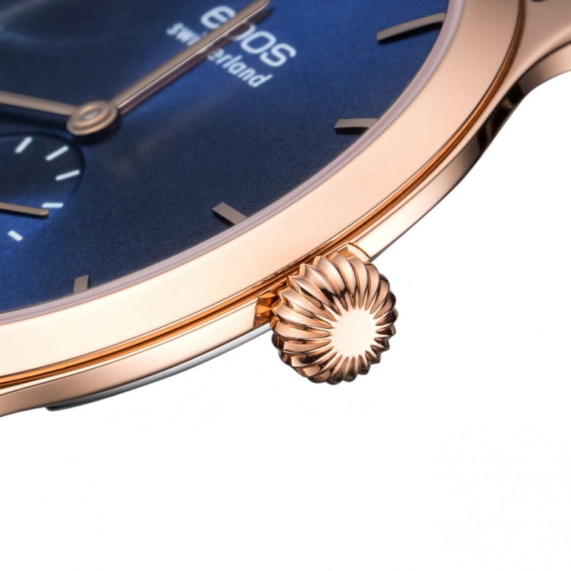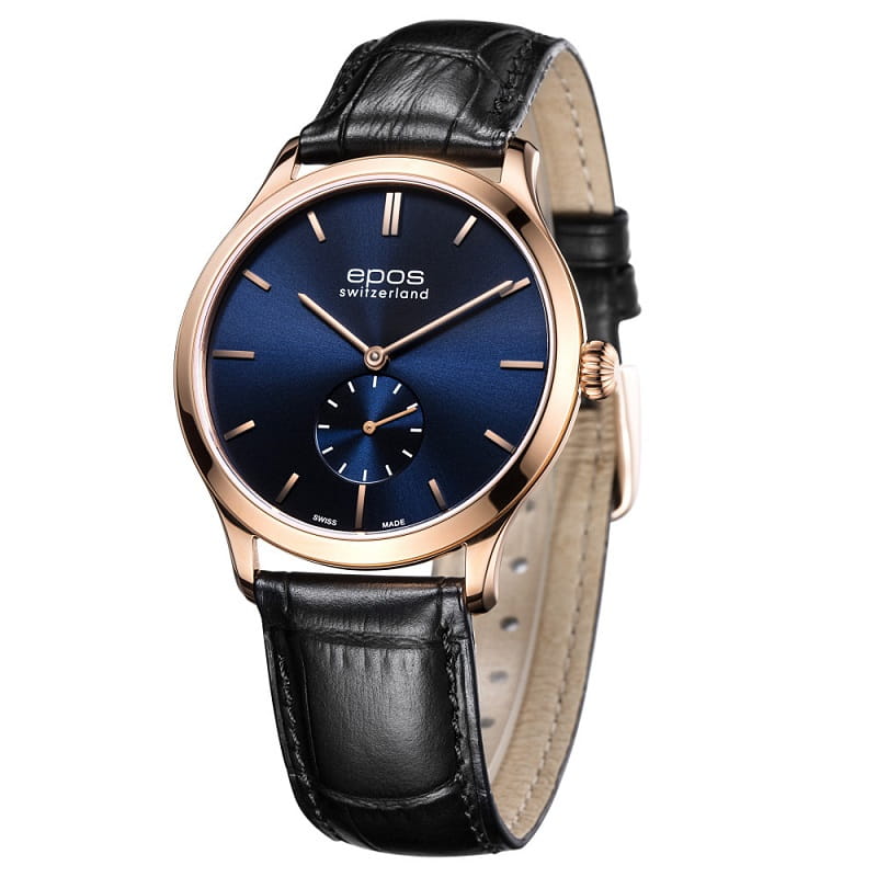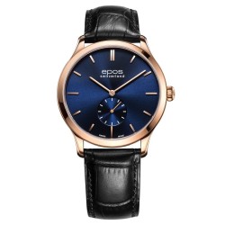 Epos Originale Elegant 3408.208.24.16.15Epos Originale Elegant 3408.208.24.16.15 to elegancki, minimalistyczny czasomierz dla mężczyzn od szwajcarskiej manufaktury, który doskonale sprawdzi się jako dodatek do każdej formalnej stylizacji. Prezentowany model 3408.208.24.16.15 wyposażono w mechanizm ręczny Peseux 7001 z 44-godzinną rezerwą chodu, który ulokowano w kopercie ze stali szlachetnej, pokrytej powłoką PVD w kolorze różowego złota, o grubości zaledwie 5,9 milimetra. Na granatowej tarczy znajdują się indeksy oraz mały zegar sekundnika, zaś za bezpieczeństwo cyferblatu odpowiada szafirowe szkło. Całość osadzona została na brązowym, skórzanym pasku z zapięciem na klamrę, które pozwala na komfortowe zakładanie i zdejmowanie zegarka. Epos Originale Elegant 3408.208.24.16.15 objęty został 2-letnią, międzynarodową gwarancją oraz zapakowany w eleganckie pudełko. Atrybuty: