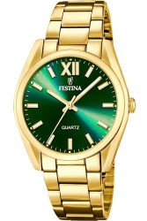 Festina F20640/9 to elegancki zegarek damski z kolekcji Boyfriend, łączący klasyczny design z nowoczesnymi akcentami. Wyposażony w precyzyjny mechanizm kwarcowy, zapewnia niezawodność i dokładność chodu.Koperta o średnicy 37 mm i grubości 9 mm wykonana jest z wysokiej jakości stali nierdzewnej pokrytej powłoką PVD w złotym kolorze, co nadaje zegarkowi luksusowy wygląd. Zielona tarcza z wyraźnymi indeksami i rzymską cyfrą XII na godzinie dwunastej dodaje charakteru i elegancji. Wskazówki pokryte powłoką luminescencyjną umożliwiają odczyt czasu w ciemności.