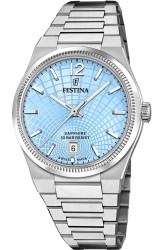 Festina Swiss Made 20052/5 Festina Swiss Made 20052/5 to wyrafinowany damski zegarek o klasycznym wyglądzie, który świetnie łączy szwajcarską precyzję z eleganckim designem. Wyposażony w niezawodny mechanizm kwarcowy, zegarek zapewnia dokładność pomiaru czasu oraz długotrwałą żywotność baterii, co czyni go doskonałym wyborem na co dzień oraz na specjalne okazje. Model ten posiada modną, tarczę "iceblue", która w połączeniu ze stalową kopertą nadaje mu ponadczasowy charakter. Szkło szafirowe chroni tarczę przed zarysowaniami, a wodoszczelność na poziomie 100 metrów pozwala na użytkowanie zegarka w różnych warunkach, także w czasie kontaktu z wodą. Główne zalety produktu