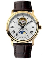 Automatyczny mechanizm FC‑335 | Tarcza ze wzorem Clous de Paris | Otwarty balans przy 12 h | Faza księżyca i wskazanie daty | Koperta 40 mm stal złocona PVD | Pasek skórzany