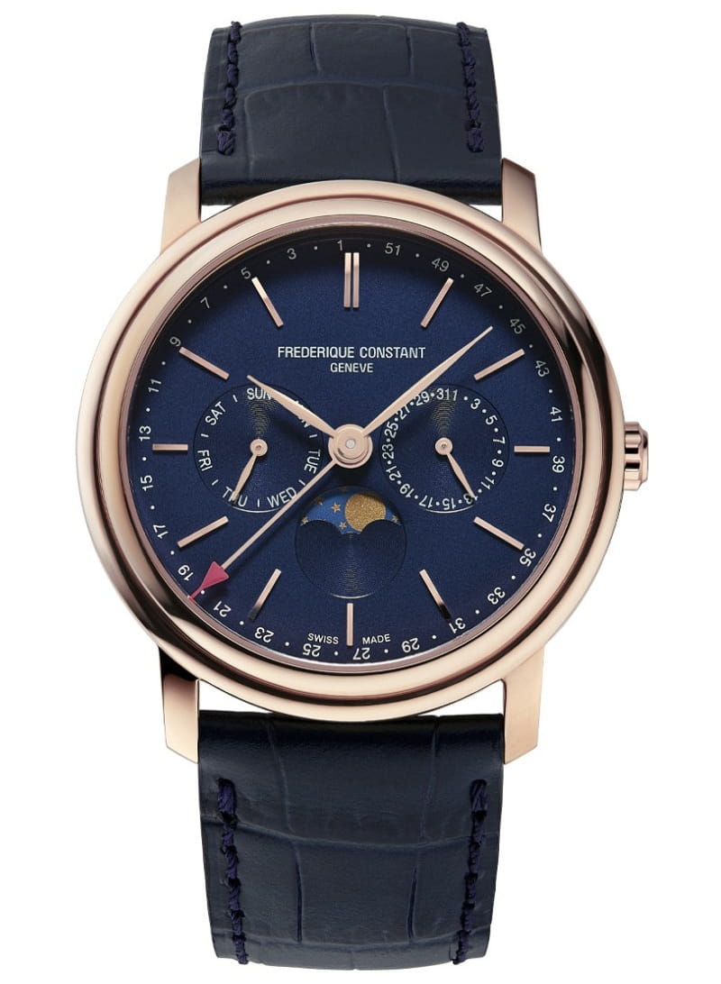 Frederique Constant FC‑270N4P4 – elegancki biznesowy kwarc z pełnym kalendarzem i granatowo-złotym wykończeniem