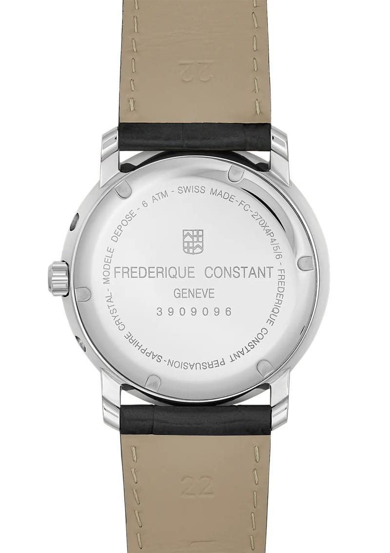 - Zapięcie: klasyczna sprzączka stalowa z logo Frederique Constant