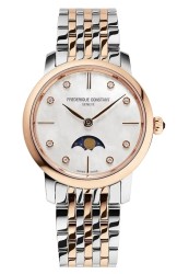 Model FC‑206MPWD1S2B z linii Classics Slimline Ladies Moonphase łączy subtelny, biżuteryjny charakter z funkcjonalnym wskazaniem faz Księżyca. Wykończenie bicolor (stal szlachetna ze złoconymi akcentami) podkreślają ponadczasową elegancję, a smukła koperta 30 mm zapewnia komfort i znakomite proporcje na drobniejszym nadgarstku.