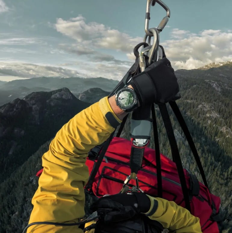 Koperta z tytanu i polimeru wzmocnionego włóknem stanowi doskonałe połączenie lekkości i odporności. Powłoka DLC (Diamond-Like Carbon) chroni przed zarysowaniami i podkreśla nowoczesny wygląd Carbon Grey. Zegarek jest odporny na uderzenia, pył i ekstremalne warunki atmosferyczne. Średnica około 47 mm i ergonomiczne wyprofilowanie zapewniają wygodę nawet podczas długich treningów i ekspedycji.