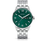 Model Hornet Empire Green Mill HE.S43S0B.ASS to nowoczesny zegarek męski utrzymany w zdecydowanej, eleganckiej stylistyce, w której dominują srebro koperty i bransolety oraz zielona tarcza. To propozycja dla osób, które oczekują połączenia minimalistycznej elegancji z wyraźnie współczesnym charakterem oraz wygody codziennego użytkowania. Smukłe indeksy, wyraźne cyfry arabskie na wybranych pozycjach oraz dopracowane proporcje sprawiają, że model prezentuje się wyraziście, ale bez przesadnej ostentacji. To zegarek zaprojektowany z myślą o użytkowniku, który lubi uporządkowaną formę, kontrastową kolorystykę i praktyczną funkcjonalność zamkniętą w nowoczesnej konstrukcji.
