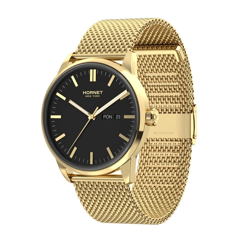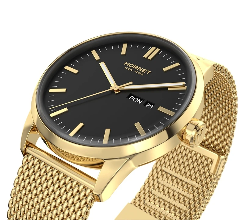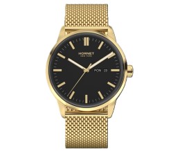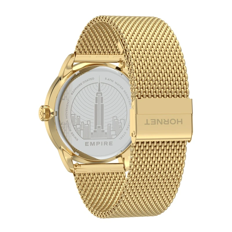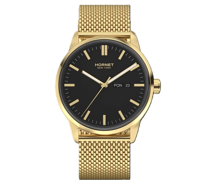 Zegarek należy do marki Hornet New York, której stylistyka opiera się na nowoczesnym, miejskim wzornictwie inspirowanym współczesną elegancją. W tym modelu zastosowano mechanizm szwajcarski Ronda, co podkreśla praktyczne i sprawdzone podejście do konstrukcji technicznej. Koperta oraz bransoleta wykonane są ze stali szlachetnej 316L, a całość utrzymana została w spójnej, złoto-czarnej kolorystyce charakterystycznej dla nowoczesnych modeli męskich. Model dobrze wpisuje się w segment nowoczesnych zegarków kwarcowych do codziennego noszenia.