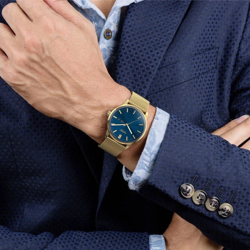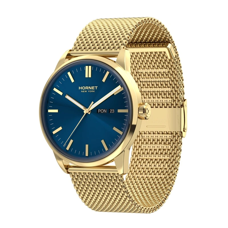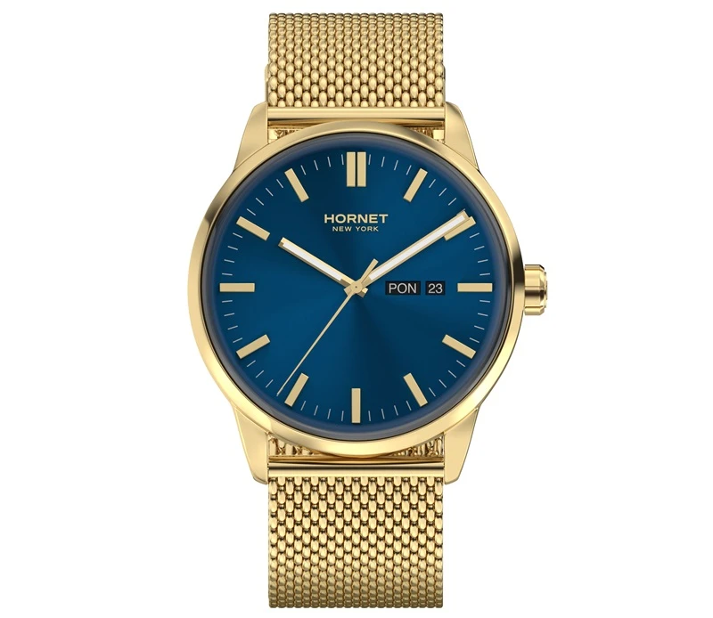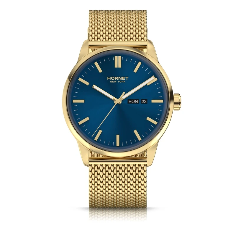 Zegarek należy do marki Hornet New York, której stylistyka opiera się na nowoczesnym, miejskim wzornictwie inspirowanym współczesną elegancją. W tym modelu zastosowano mechanizm szwajcarski Ronda, co podkreśla praktyczne i sprawdzone podejście do konstrukcji technicznej. Koperta oraz bransoleta wykonane są ze stali szlachetnej 316L, a całość utrzymana została w spójnej, złoto-granatowej kolorystyce charakterystycznej dla nowoczesnych modeli męskich. Model dobrze wpisuje się w segment nowoczesnych zegarków kwarcowych do codziennego noszenia.