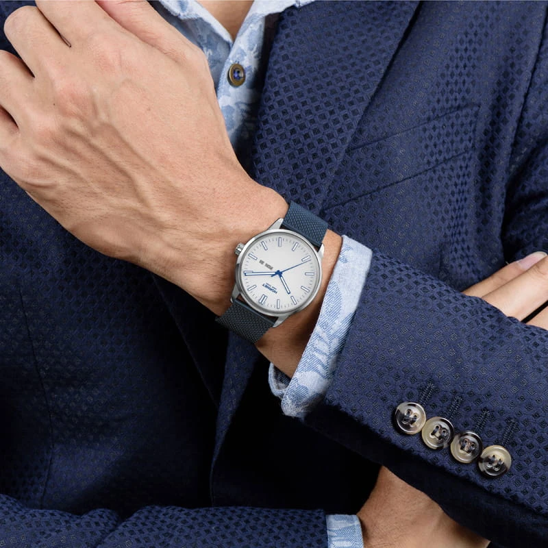 - Kolor i wykończenie: jasna, uporządkowana tarcza z niebieskimi akcentami nadaje zegarkowi lekki i elegancki charakter, a jej powierzchnia została zaprojektowana tak, aby dobrze współgrać ze światłem i nie powodować nadmiernych refleksów.
