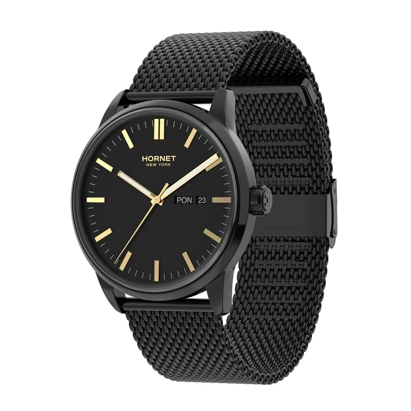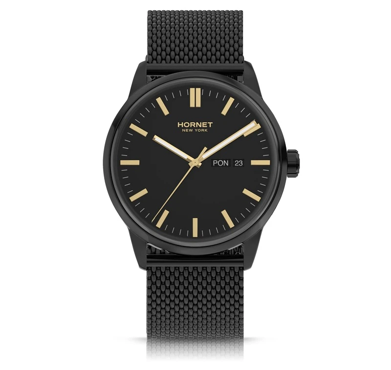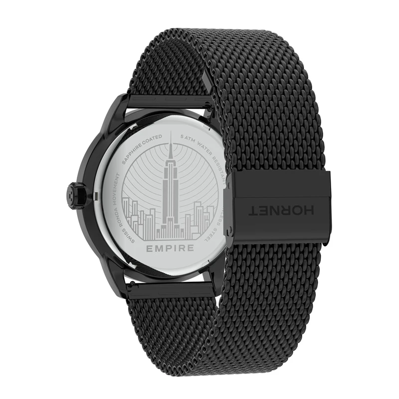 Zegarek należy do marki Hornet New York, której stylistyka opiera się na nowoczesnym, miejskim wzornictwie inspirowanym współczesną elegancją. W tym modelu zastosowano mechanizm szwajcarski Ronda, co podkreśla praktyczne i sprawdzone podejście do konstrukcji technicznej. Koperta oraz bransoleta wykonane są ze stali szlachetnej 316L, a całość utrzymana została w spójnej kolorystyce charakterystycznej dla nowoczesnych modeli męskich. Model dobrze wpisuje się w segment nowoczesnych zegarków kwarcowych do codziennego noszenia.