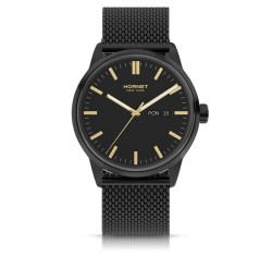 Model Hornet Empire Shreve HE.B43B0M.BGG to nowoczesny zegarek męski utrzymany w zdecydowanej, eleganckiej stylistyce, w której dominuje kolor czarny koperty i bransolety oraz tarcza z akcentami w kolorze złotym. To propozycja dla osób, które oczekują połączenia minimalistycznej elegancji z wyraźnie współczesnym charakterem oraz wygody codziennego użytkowania. Smukłe indeksy oraz dopracowane proporcje sprawiają, że model prezentuje się wyraziście, ale bez przesadnej ostentacji. To zegarek zaprojektowany z myślą o użytkowniku, który lubi uporządkowaną formę, kontrastową kolorystykę i praktyczną funkcjonalność zamkniętą w nowoczesnej konstrukcji.