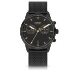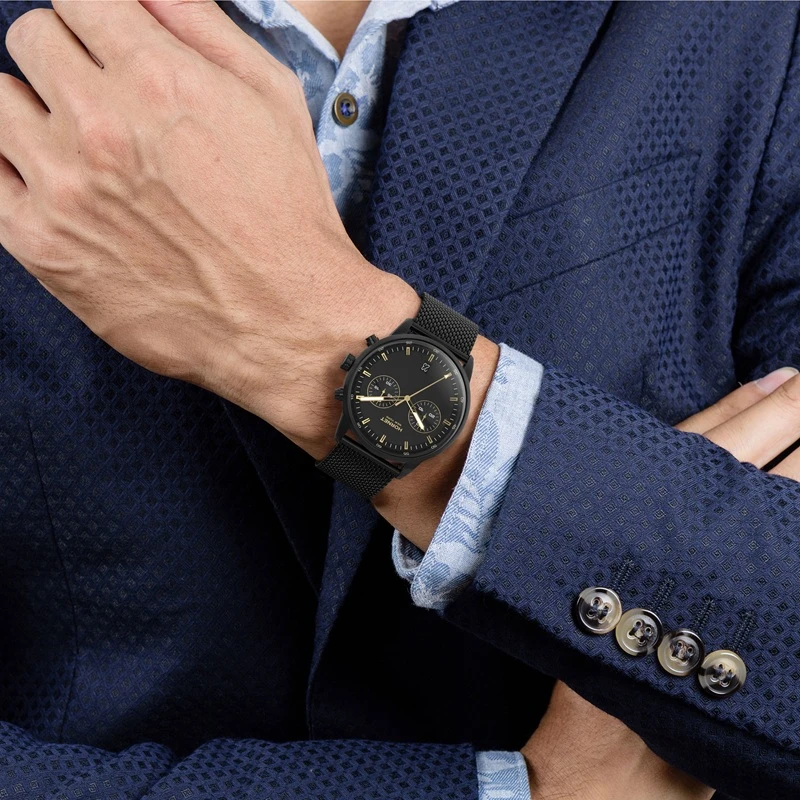 Czarna tarcza buduje zdecydowany i nowoczesny charakter zegarka, który od razu przyciąga uwagę swoją spójnością stylistyczną. Kontrastujące indeksy oraz wskazówki w kolorze złotym zapewniają bardzo dobrą czytelność, nawet przy słabszym oświetleniu. Minimalistyczny układ elementów sprawia, że zegarek nie jest przeładowany wizualnie, a wszystkie informacje są czytelne i intuicyjne. Tarcza została zaprojektowana w sposób uporządkowany, co podkreśla elegancję modelu. To właśnie ona nadaje zegarkowi jego wyrazisty, miejski styl.