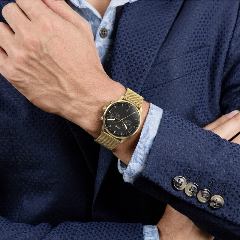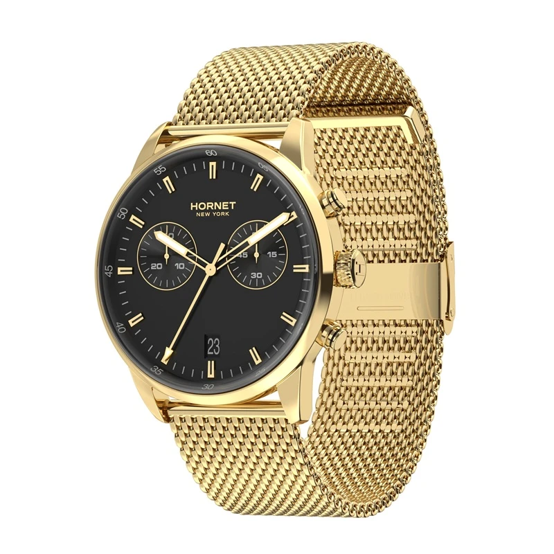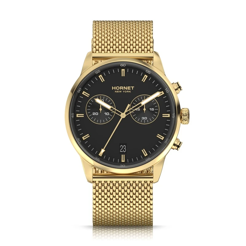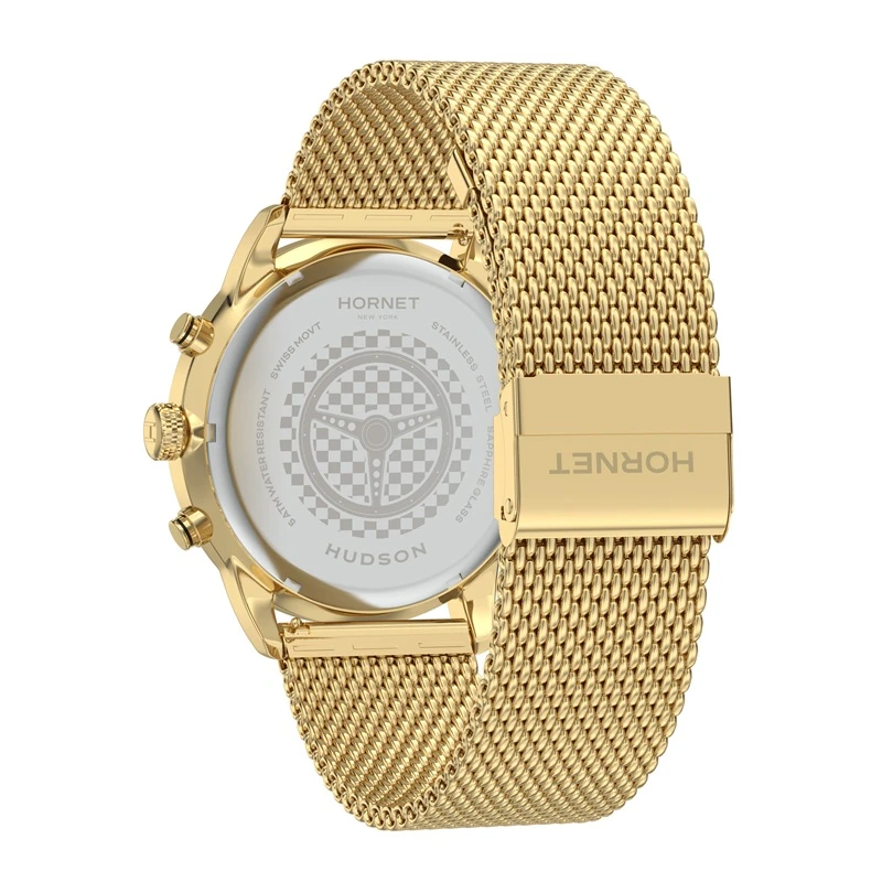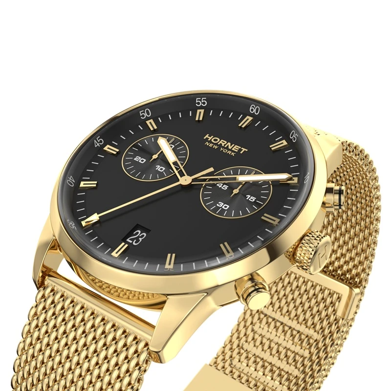 Model Hornet New York Hudson Speedway HH.G43G10.BGG to zegarek zaprojektowany w zdecydowanej, męskiej stylistyce, w której dominuje głęboka czerń tarczy, oraz złota kolorystyka koperty i bransolety. Całość utrzymana jest w spójnym, nowoczesnym stylu, który dobrze wpisuje się w miejski charakter i aktualne trendy wzornicze. Zegarek przyciąga uwagę swoją prostotą, ale jednocześnie zachowuje wyrazisty charakter dzięki kontrastującym detalom. To propozycja dla osób, które szukają zegarka codziennego, ale jednocześnie chcą, aby był on mocnym elementem stylizacji. Model łączy funkcjonalność z estetyką, tworząc spójny i dopracowany projekt.