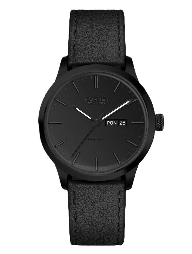 Model Hornet New York NYC Brooklyn HN.B40B0L.BBB to zegarek męski utrzymany w nowoczesnej, minimalistycznej stylistyce, w której czarna koperta, czarna tarcza i czarny skórzany pasek tworzą bardzo spójną, wyrazistą całość. Czarne indeksy i wskazówki nadają temu modelowi eleganckiego kontrastu, dzięki czemu zegarek zachowuje dobrą czytelność i nie traci lekkiego, miejskiego charakteru. To propozycja dla mężczyzny, który szuka dodatku nowoczesnego, uporządkowanego i uniwersalnego, ale jednocześnie niepozbawionego charakteru. Ciekawostką jest funkcja day-date z polskimi skrótami dni tygodnia. Datownik oraz szwajcarski mechanizm kwarcowy podkreślają praktyczny wymiar tego modelu przeznaczonego do regularnego użytkowania.
