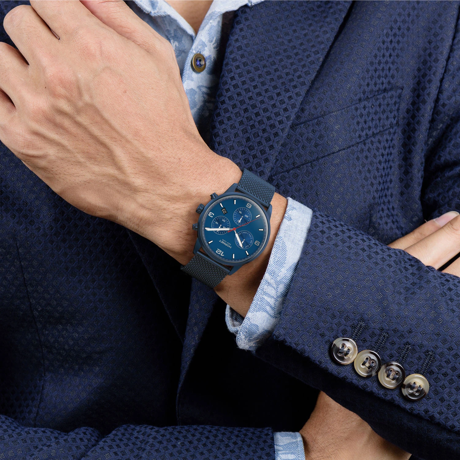 Model Hornet New York Performance Broadway HP.N43N10.NSR to zegarek dla mężczyzny, który lubi wyraziste dodatki o sportowym, ale nadal eleganckim charakterze. Sprawdzi się u osób ceniących mocną kolorystykę, rozbudowaną tarczę z funkcjami dodatkowymi oraz solidną stalową konstrukcję. Granatowa koperta i bransoleta nadają mu nowoczesnej surowości, natomiast złote akcenty wprowadzają bardziej szlachetny, dopracowany wygląd. To propozycja dla użytkownika, który szuka modelu praktycznego, charakternego i dobrze widocznego na nadgarstku. Dobrze odnajdzie się u mężczyzn preferujących miejską elegancję z dynamicznym akcentem.
