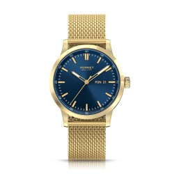 Model Hornet New York NYC Queensbridge HN.G40G0M.NGG to zegarek męski utrzymany w eleganckiej, wyrazistej stylistyce, w której głęboka granatowa tarcza została zestawiona ze złotą kopertą oraz złotą bransoletą typu mesh. Taki układ kolorystyczny nadaje całości bardziej luksusowego charakteru, ale jednocześnie pozostaje bardzo uporządkowany i czytelny, dzięki czemu model dobrze sprawdza się także w codziennym użytkowaniu. Smukłe indeksy, proste wskazówki i praktyczne okienko day-date tworzą spójną kompozycję o miejskim, nowoczesnym charakterze. To propozycja dla mężczyzny, który szuka zegarka eleganckiego, ale nieprzesadzonego, z dobrze wyważonym połączeniem klasyki i nowoczesności.