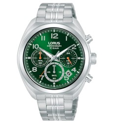 Lorus Sports Chronograph RT391KX9 – sportowy chronograf kwarcowy z zieloną tarczą i stalową bransoletą.