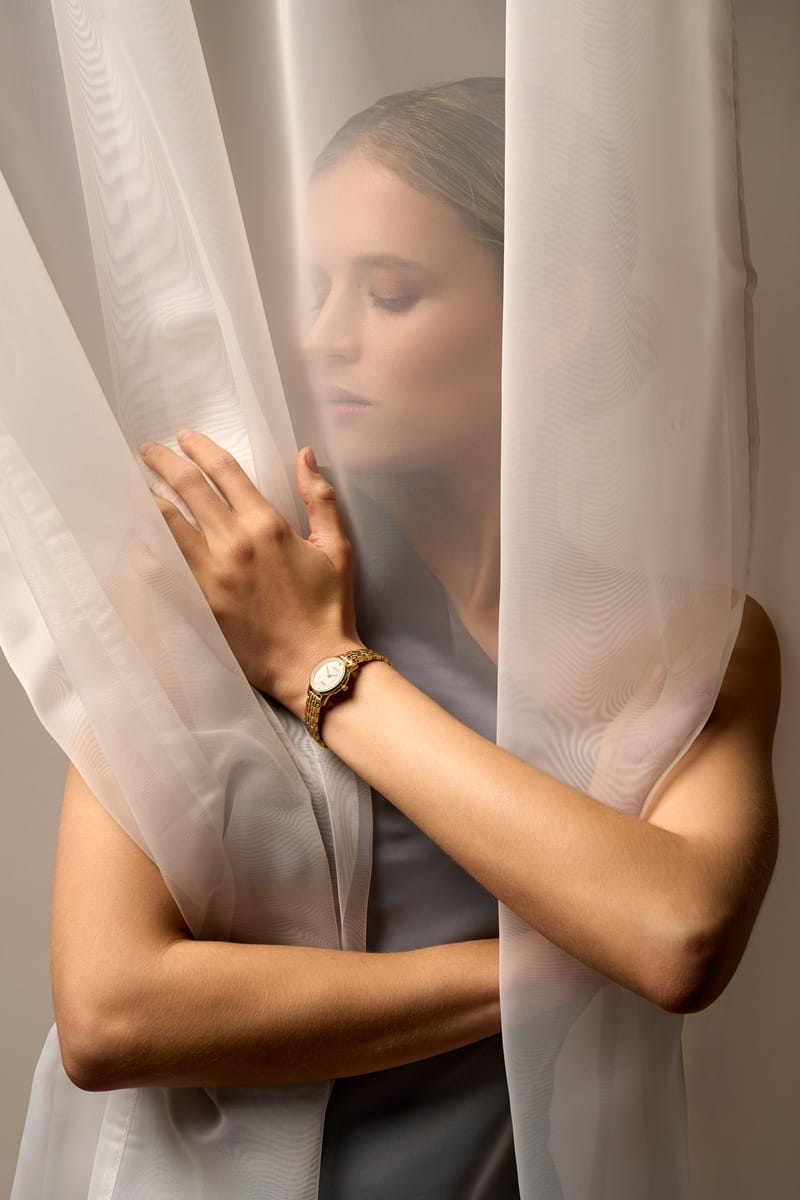 Zegarek wyróżnia się tarcza z białej masy perłowej, która nadaje mu subtelnego blasku i kobiecego uroku. Minimalistyczne wskazania czasu oraz złote akcenty podkreślają jego biżuteryjny charakter. To tarcza, która doskonale współgra z całą konstrukcją, czyniąc zegarek eleganckim i ponadczasowym.