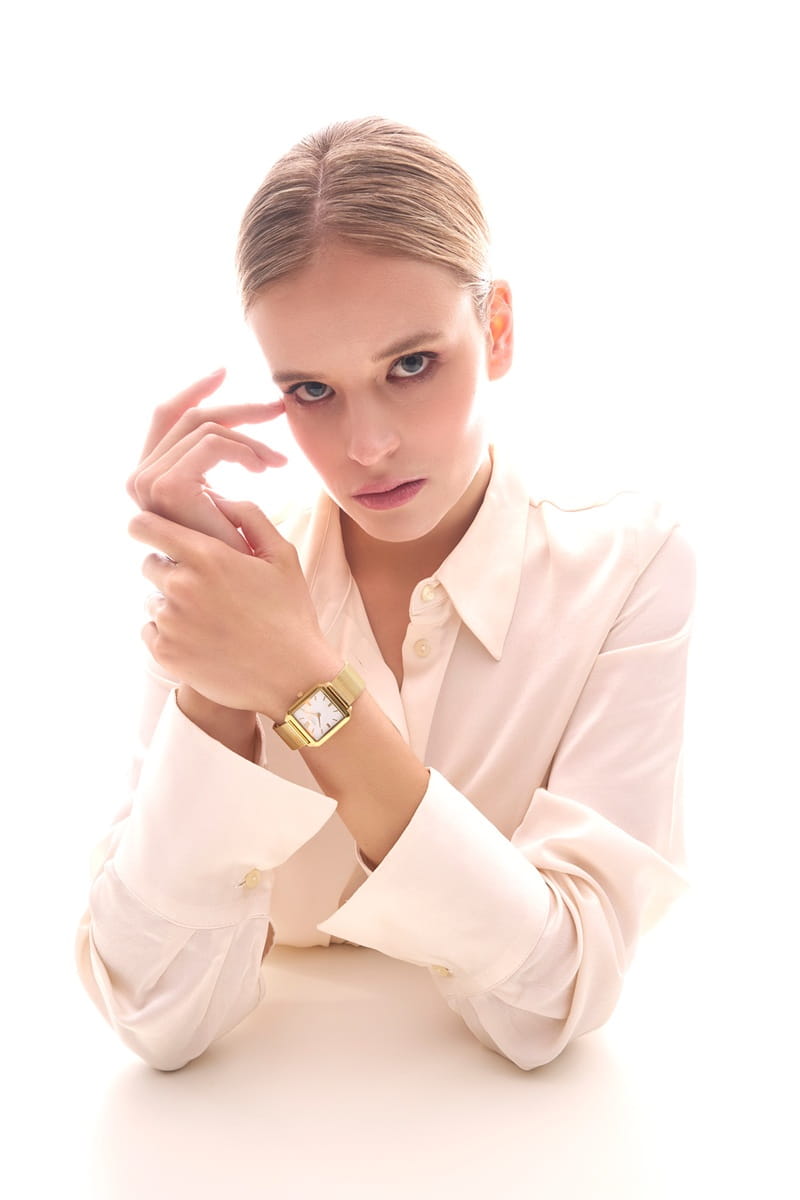 Koperta zegarka została wykonana z wysokiej jakości stali nierdzewnej pokrytej złotą powłoką metodą IP, która zapewnia trwałość i odporność na ścieranie. Kwadratowa forma o szerokości 26 mm i ultracienkim profilu poniżej 5 mm podkreśla jego nowoczesny i elegancki charakter. To zegarek, który doskonale leży na nadgarstku, łącząc wygodę z efektownym designem.