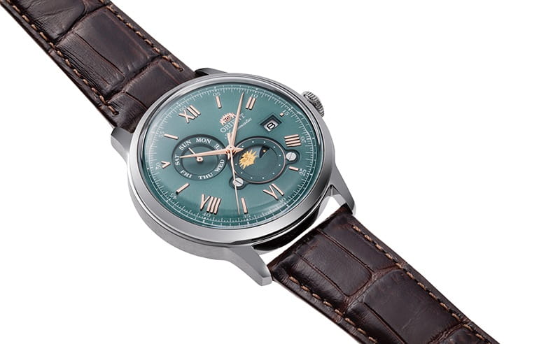 - Automatyczny mechanizm Orient F6B24 – niezawodny i precyzyjny, nie wymaga baterii.