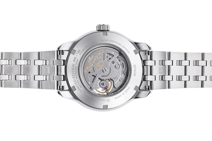 Automatyczny japoński mechanizm Orient Star F6F44 z możliwością ręcznego dokręcania i wskaźnikiem rezerwy chodu.