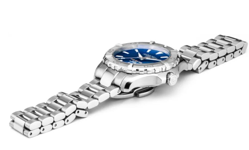 Stalowa bransoleta w modelu Deep Sea 200 została zaprojektowana z myślą o komforcie i trwałości. Posiada klasyczne, szczotkowane ogniwa oraz bezpieczne zapięcie motylkowe. Doskonale dopasowuje się do kobiecego nadgarstka i pozwala nosić zegarek przez cały dzień bez uczucia dyskomfortu. To uniwersalne rozwiązanie łączące styl sportowy z elegancją.