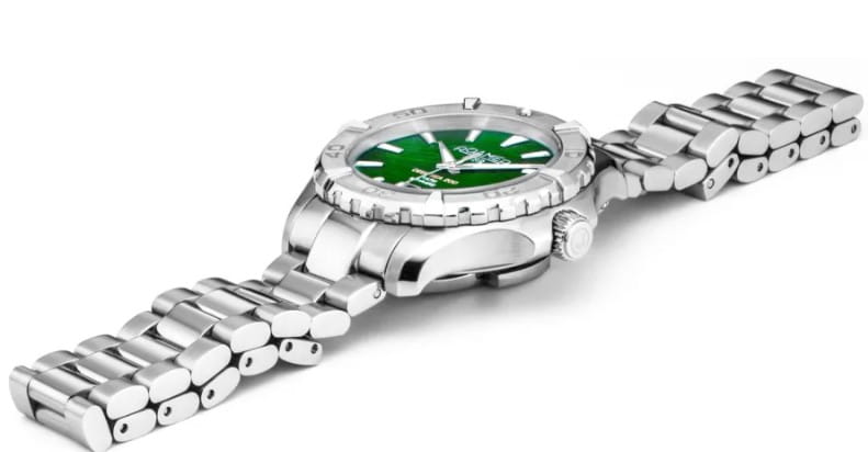 Damski zegarek szwajcarski o sportowym charakterze, z intensywnie zieloną tarczą, masywną stalową kopertą oraz klasą wodoszczelności 200 m – idealny do pływania i codziennego noszenia. Zestawiony na stalowej bransolecie z wygodnym zapięciem motylkowym.