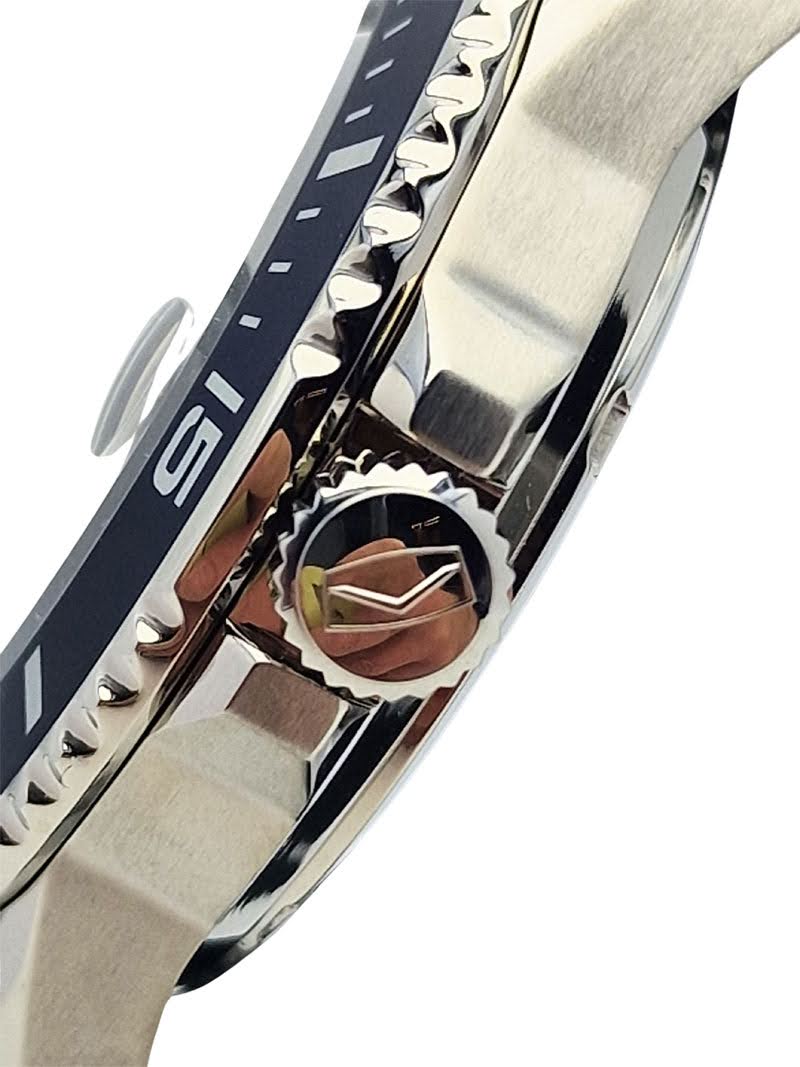 Koperta zegarka wykonana jest z wysokogatunkowej stali nierdzewnej 316L, odpornej na korozję i warunki morskie. Jej średnica 40 mm i wyprofilowane uszy zapewniają wygodne dopasowanie do nadgarstka, a obrotowy bezel z czarną wkładką nadaje zegarkowi typowo nurkowego charakteru. Całość uzupełnia zakręcany dekiel i koronka, które zwiększają wodoszczelność do poziomu 200 metrów.