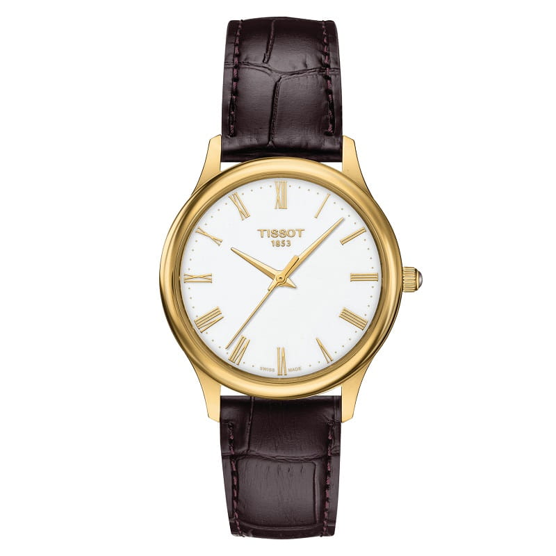 Zegarek Tissot Excellence Lady 18K Gold T926.210.16.013.00Tissot Excellence Lady T926.210.16.013.00 to wyjątkowo elegancki, damski zegarek. Koperta o średnicy 32 milimetrów została wykonana z 18-karatowego, żółtego złota. Czasomierz posiada białą tarczę, na której umieszczono pozłacane indeksy, cyfry rzymskie i wskazówki. Całość osadzona na czarnym, skórzanym pasku z klasycznym zapięciem na klamerkę. Kwarcowy mechanizm zegarka zapewnia precyzję i dokładność. Ochroną dla tarczy jest bardzo wytrzymałe szkło szafirowe które jest bardzo twarde i niezwykle odporne na zarysowania, dzięki czemu posiada nienaganny wygląd przez lata. Klasa wodoszczelności jest na poziomie 30M, dlatego warto uważać na wszelki kontakt z wodą. Tissot T926.210.16.013.00 to klasyczny zegarek, który zachwyca swym minimalizmem. Dopracowany w najmniejszym szczególe sprawia, że nie można przejść obok niego obojętnie. Detal, który ma znaczenieProstota i elegancja idealnie określają model wykonany ze złota. Ze względu na materiał wykonania koperty zegarek jest również dobrą inwestycją, która nie straci na swej wartości. Główne zalety zegarka Tissot T926.210.16.013.00