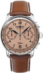 Model **Zeppelin 100 Jahre 7674-5** to elegancki zegarek inspirowany 100-letnią historią niemieckiej marki Zeppelin. Jego **brązowa tarcza z arabskimi cyframi**, klasyczna **stalowa koperta** oraz **brązowy skórzany pasek** sprawiają, że wyróżnia się ponadczasowym stylem i wyjątkową estetyką.Napędzany przez **precyzyjny mechanizm kwarcowy**, zegarek oferuje niezawodność oraz dodatkowe funkcje, takie jak **chronograf i datownik**.
