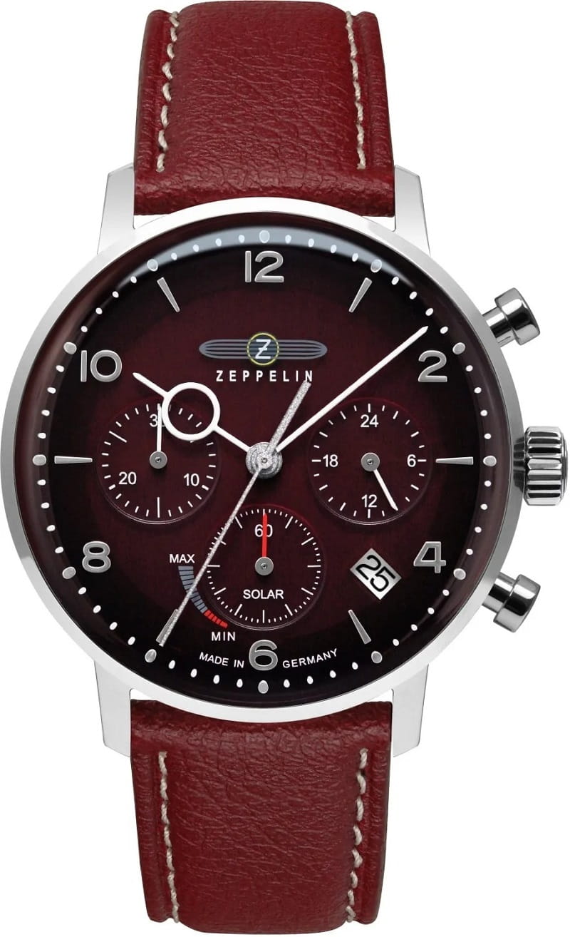 Czerwona tarcza z mieszanymi indeksami i subtelnym wzornictwem nawiązuje do klasycznych zegarków Zeppelin.