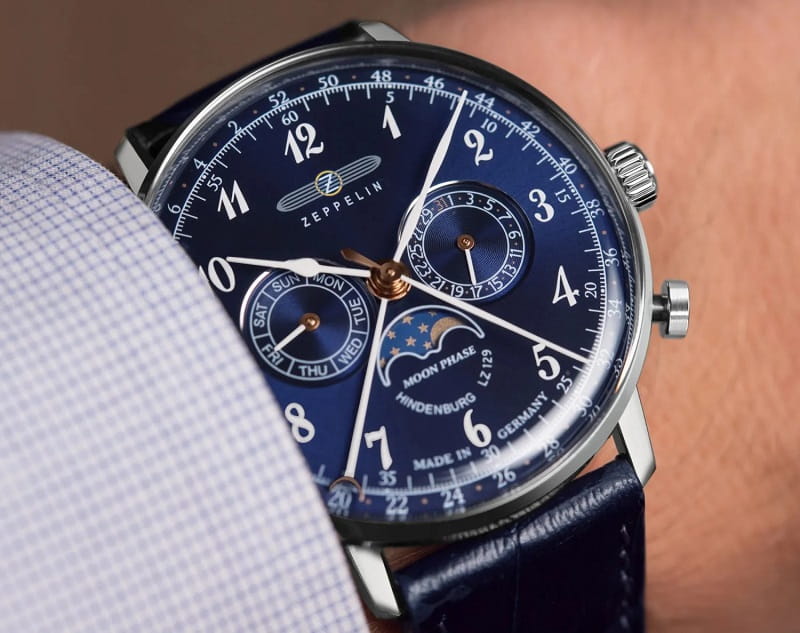 Model **Zeppelin LZ 129 Hindenburg 7036-3** to elegancki zegarek inspirowany luksusowymi sterowcami z lat 30. XX wieku. Granatowa tarcza i skórzany pasek podkreślają jego klasyczny styl, a **wysokiej jakości mechanizm kwarcowy** zapewnia niezawodność.Koperta zegarka wykonana jest z **wysokogatunkowej stali szlachetnej**, a jej **średnica 40 mm** sprawia, że zegarek doskonale prezentuje się na nadgarstku. Charakterystycznym elementem jest **wskaźnik faz księżyca**, który nadaje zegarkowi wyjątkowego charakteru.