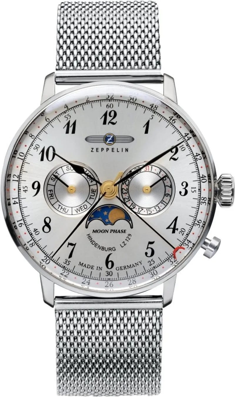 Model **Zeppelin LZ 129 Hindenburg 7036M-1** to elegancki zegarek inspirowany historycznym sterowcem Hindenburg. Stalowa koperta w połączeniu ze srebrną tarczą oraz stylową bransoletą mesh sprawia, że zegarek prezentuje się niezwykle klasycznie i szykownie.Zegarek wyposażony jest w **szwajcarski mechanizm kwarcowy**, który gwarantuje **wysoką precyzję** oraz obsługę funkcji dodatkowych, takich jak **wskaźnik faz księżyca**, **datownik** oraz **wskaźnik dnia tygodnia**.