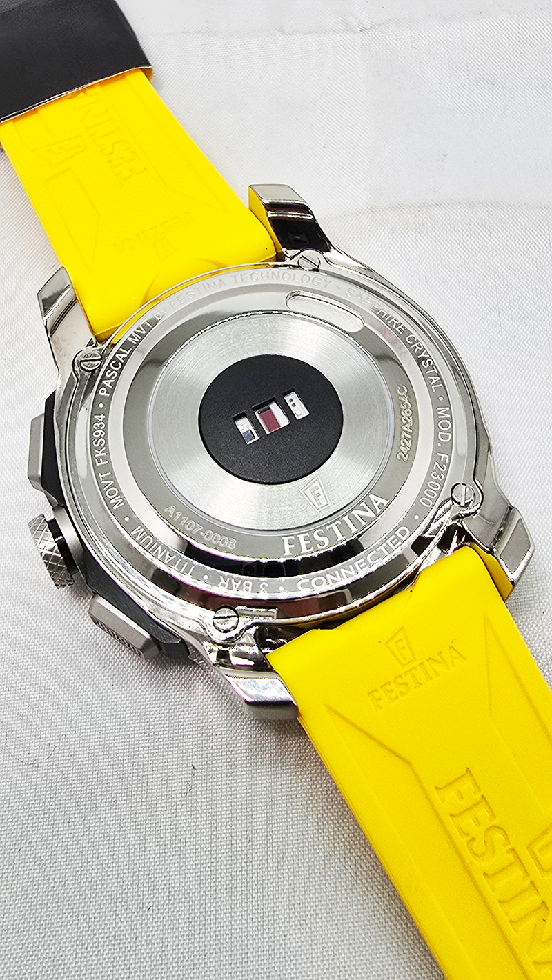 Festina Connected F23000/8 to hybrydowy zegarek męski, który łączy w sobie nowoczesne funkcje smartwatcha z klasycznym stylem tradycyjnego czasomierza. Koperta o średnicy 44 mm wykonana z tytanu jest lekka, trwała i odporna na korozję, co czyni ten model idealnym na co dzień. Niebieska tarcza chroniona jest przez szafirowe szkło, zapewniające wyjątkową odporność na zarysowania.Urządzenie oferuje szereg funkcji smart, takich jak śledzenie aktywności fizycznej, monitorowanie snu, odbieranie powiadomień z telefonu, a także alarm, timer, stoper oraz sterowanie muzyką. Dzięki cyfrowemu wyświetlaczowi umieszczonemu na tarczy użytkownik ma łatwy dostęp do wszystkich kluczowych informacji. Żółty silikonowy pasek dodaje sportowego charakteru i zapewnia wysoki komfort noszenia, idealnie współgrając z wytrzymałą kopertą.