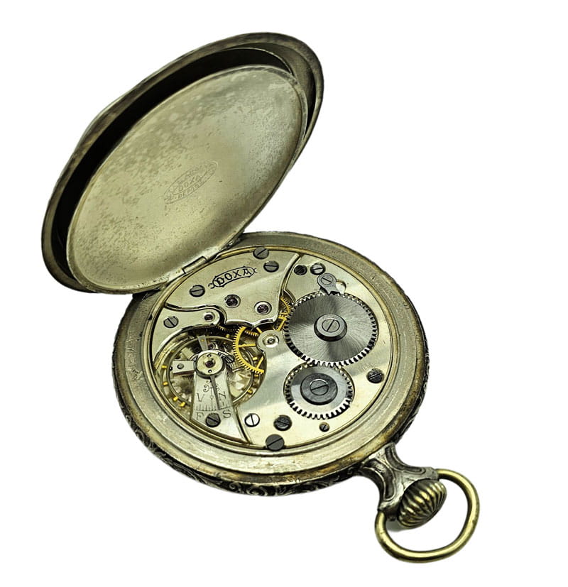 Koperta zegarka wykonana jest ze srebra i zachowana została w oryginalnym stanie, bez polerowania, z piękną, naturalną patyną. Jej obrzeże zdobi misterny relief o motywach roślinnych, charakterystyczny dla epoki secesji, który podkreśla artystyczny charakter całego modelu. Wewnętrzny dekiel zawiera wybitą sygnaturę DOXA, oznaczenie medalowe (Médaille d’Or Milan 1906) oraz napis Liège 1905, potwierdzający rok powstania zegarka. Na szczycie znajduje się klasyczna koronka z ozdobnym kominkiem, przystosowana do zawieszenia na łańcuszku.
