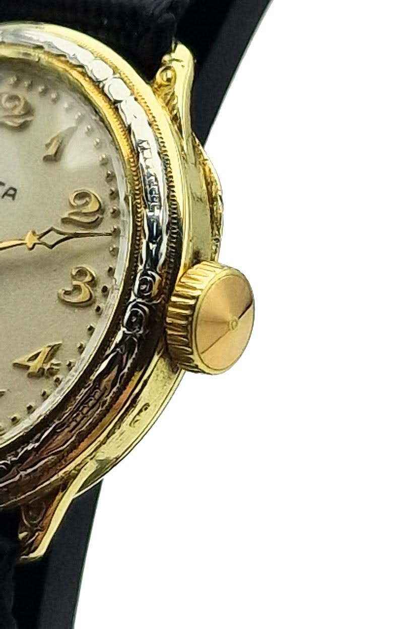 Zegarek RECTA to ponadczasowa perełka sztuki zegarmistrzowskiej, stworzona w Szwajcarii w latach 30., kiedy elegancja spotykała się z precyzją. Jego kunsztownie grawerowana koperta z litego złota 14K, złocone wskazówki typu Cathedral oraz klasyczny mechanizm A. Schild 970 tworzą harmonijną całość o wyjątkowym uroku. To nie tylko zegarek, ale prawdziwy fragment historii - idealny dla koneserów i miłośników stylu art déco, którzy cenią autentyczność i subtelne piękno dawnych czasów.