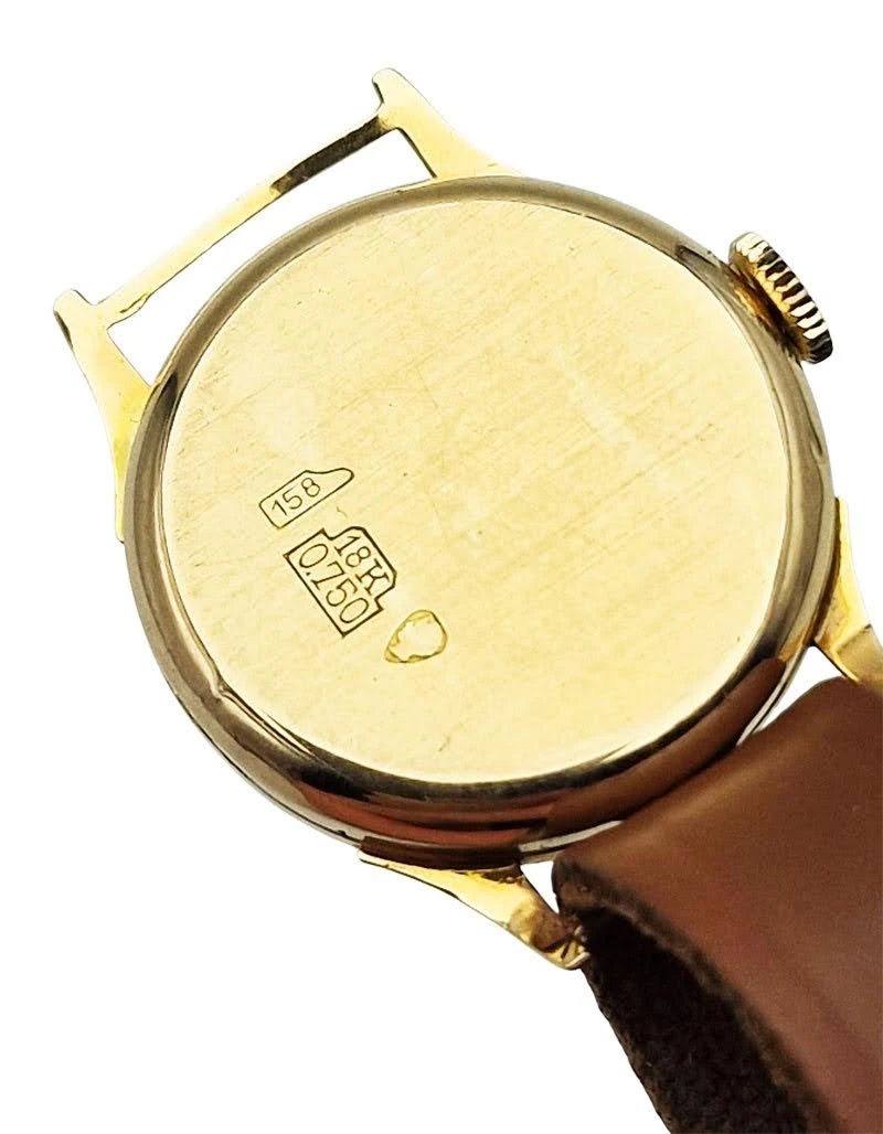 Koperta została wykonana w całości ze złota próby 18K, co nadaje zegarkowi wyraźnie szlachetny i kolekcjonerski charakter. Jej smukła forma ze sztywnymi uszami przystosowana jest do paska przewlekanego i dobrze wpisuje się w stylistykę lat 50. Dekiel jest zaciskany i oznaczony próbą złota, a całość dopełnia oryginalna, karbowana koronka utrzymana w spójnym kolorze.
