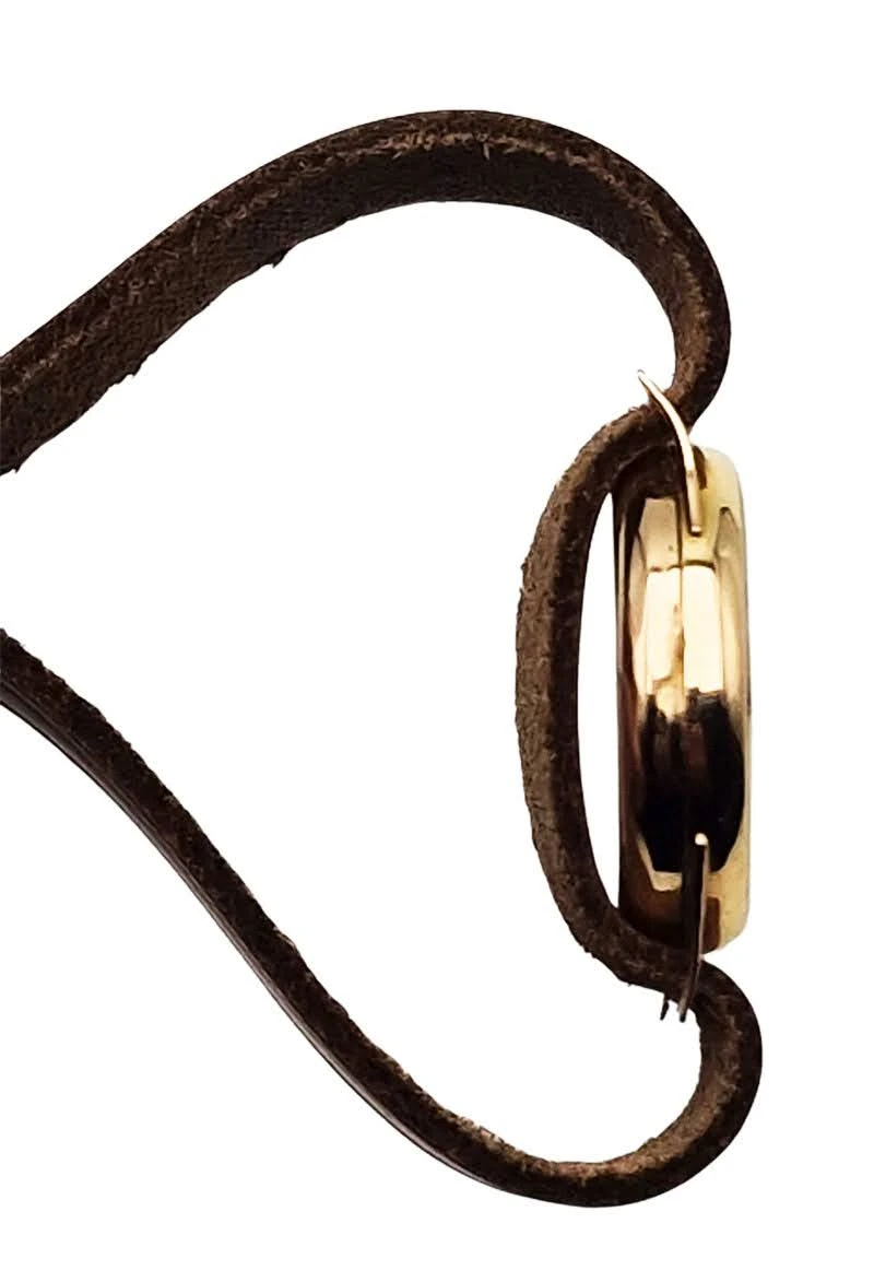 Pasek wykonany jest ze skóry naturalnej w formie przewlekanej, co jest rozwiązaniem typowym dla zegarków z tego okresu i konstrukcji ze sztywnymi uszami. Jego szerokość wynosi 10 mm, dzięki czemu zachowuje odpowiednie proporcje względem smukłej koperty. Maksymalny obwód zegarka to ok. 19,5 cm, a całość zapinana jest na klasyczną stalową klamerkę, zapewniającą wygodę i trwałość.