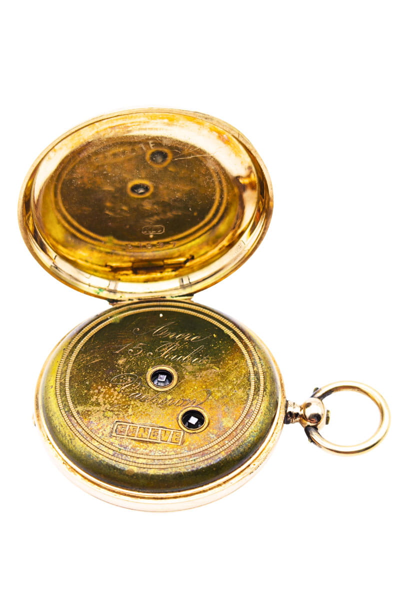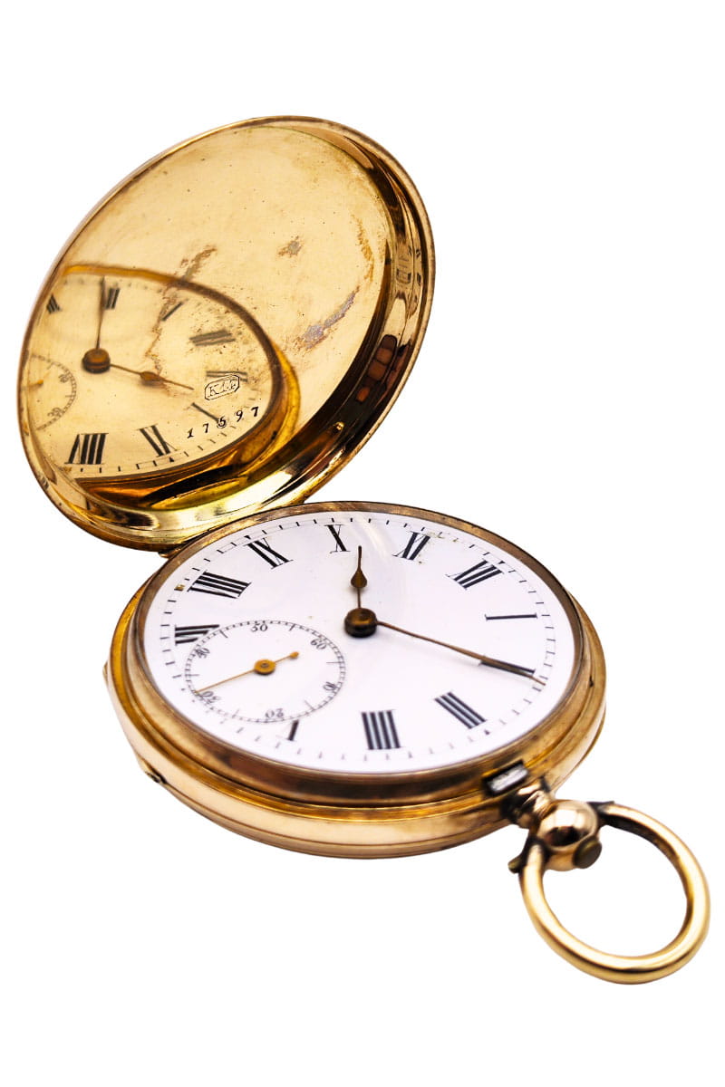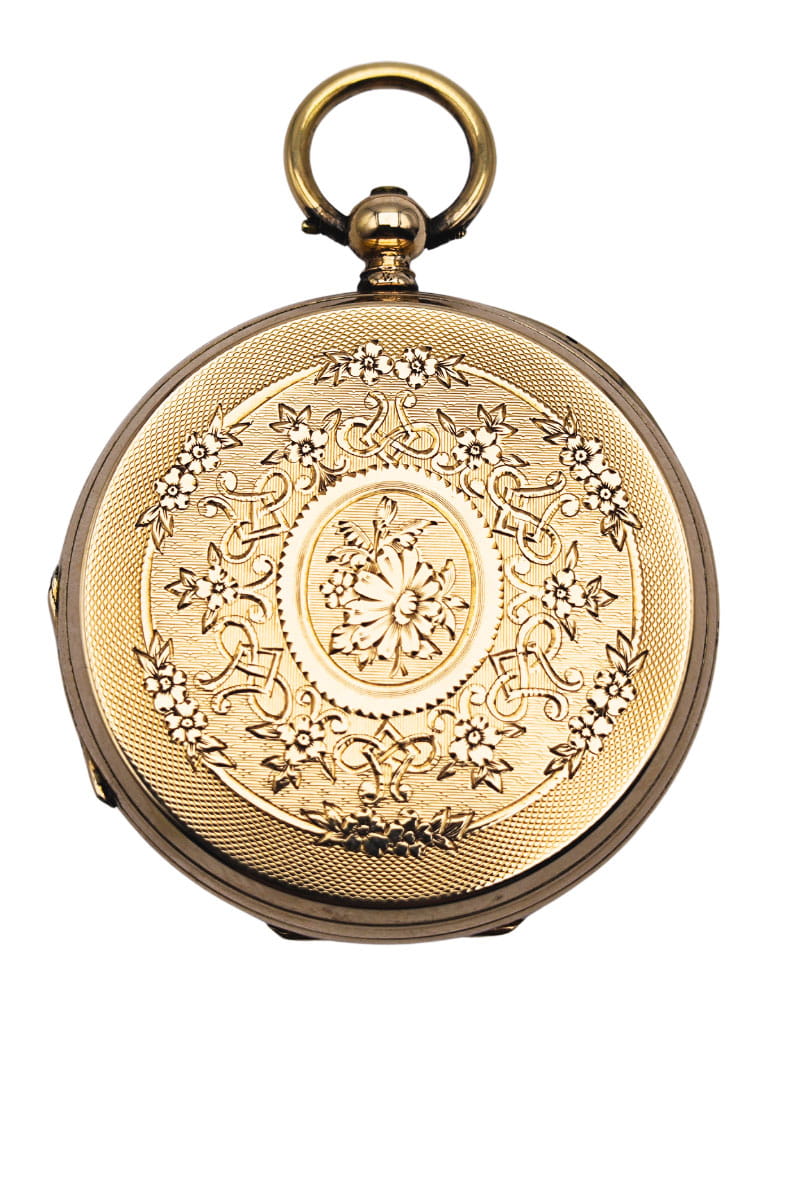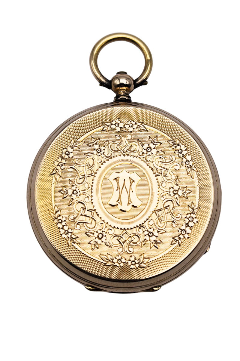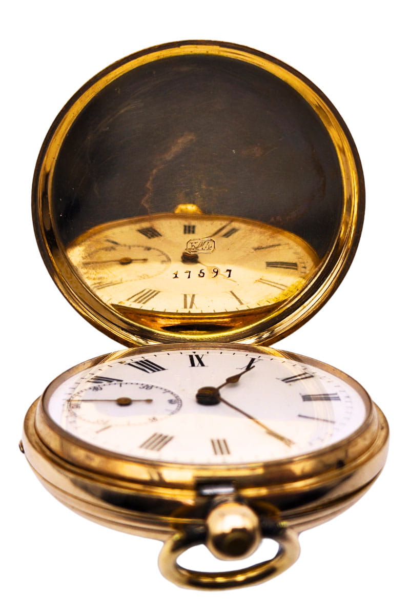 Koperta zegarka została wykonana ze złota 14K i zachowana jest w oryginalnym stanie, bez śladów renowacji. To klasyczna trzykomorowa konstrukcja - składająca się z przedniej pokrywy, tylnego dekla oraz wewnętrznej osłony mechanizmu - typowa dla zegarków kieszonkowych wyższej klasy z początku XX wieku.