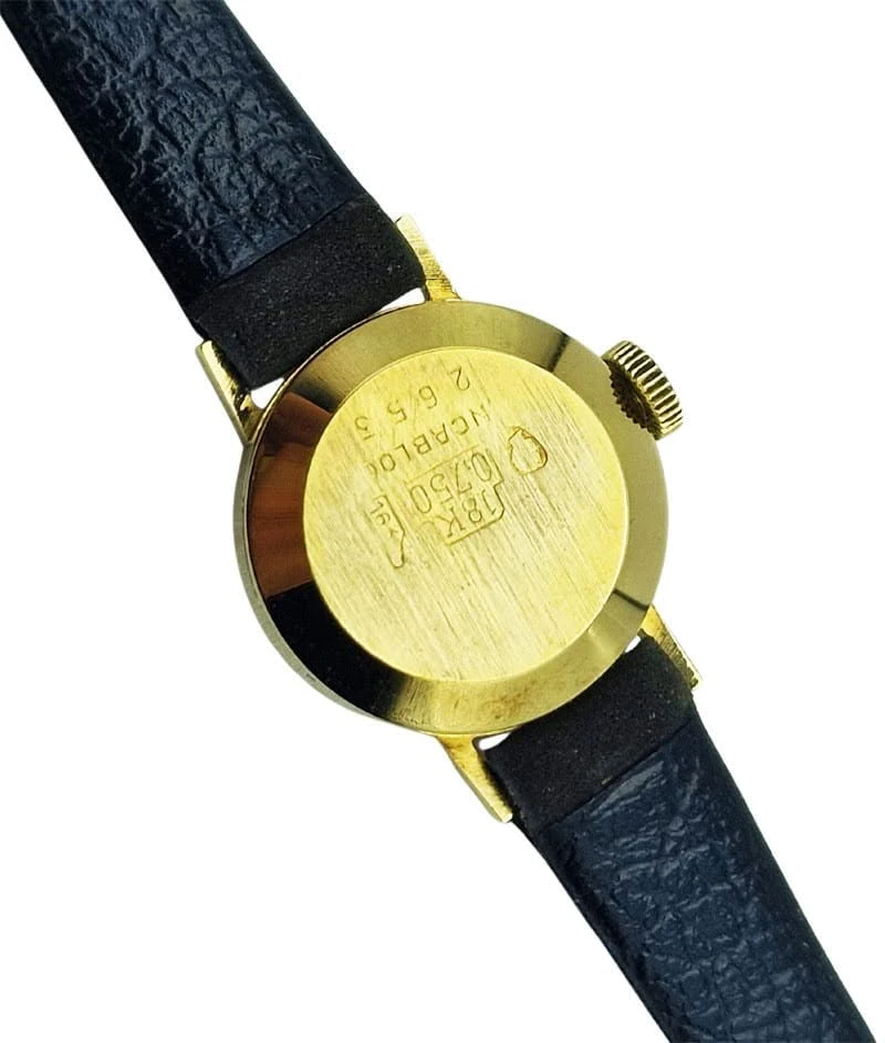 Koperta wykonana jest ze złota 18K (0.750) i utrzymana w eleganckim, klasycznym wykończeniu. Ma okrągły, bardzo smukły kształt, charakterystyczny dla damskich zegarków z lat 60. Dekiel jest pełny, z oznaczeniem próby i numerem 2653, a całość uzupełnia karbowana koronka w kolorze złota.