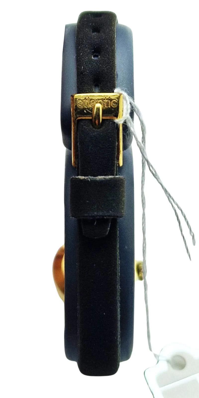 Pasek wykonany jest ze skóry naturalnej w kolorze czarnym, dobrze dopasowanej do klasycznego charakteru zegarka. Jego szerokość wynosi 8 mm, co zachowuje proporcje względem niewielkiej koperty i zapewnia komfort noszenia. Całość uzupełnia oryginalna klamerka Atlantic, a maksymalny obwód wynosi około 16,5 cm.